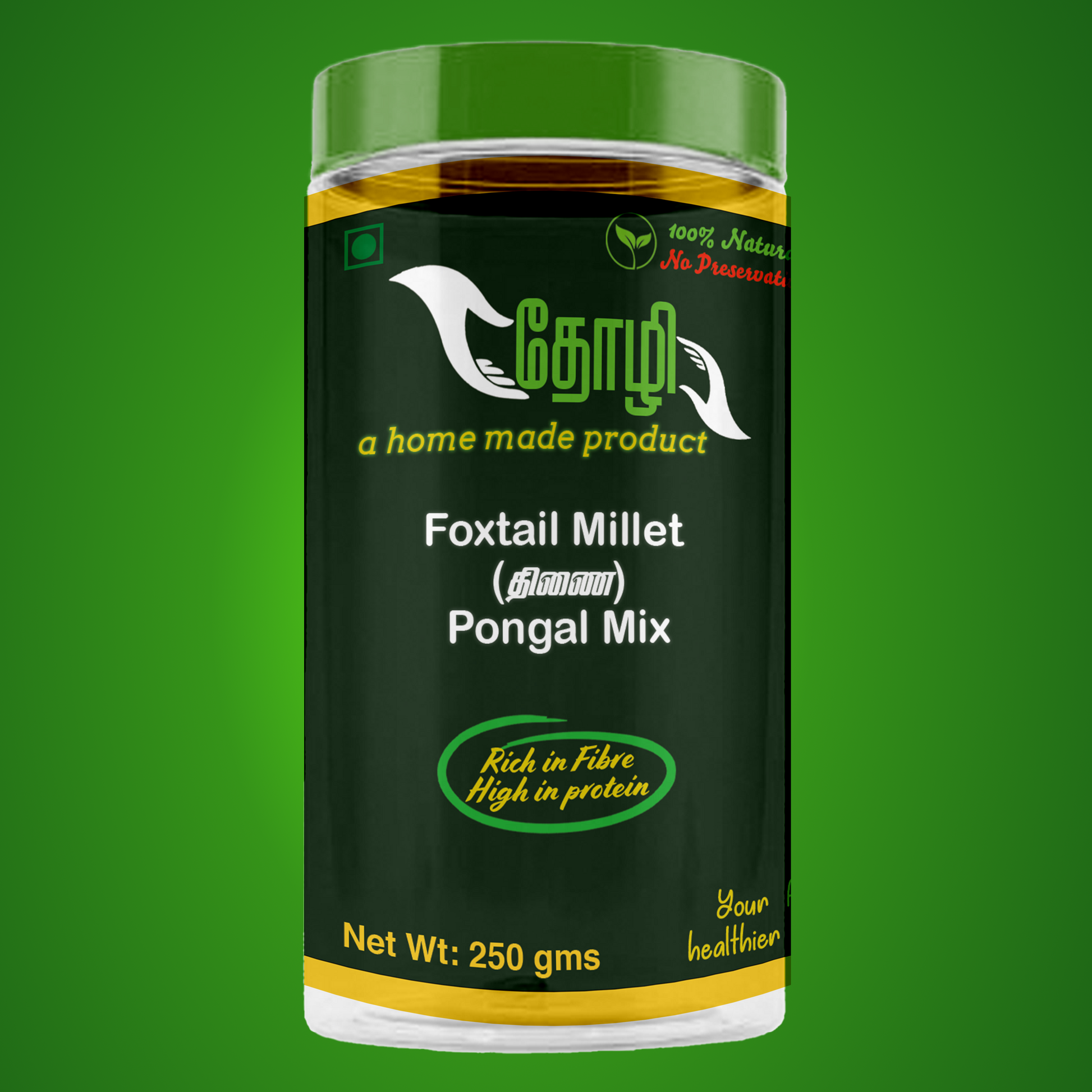 Indulge in the wholesome goodness of our Millet Pongal mix, carefully crafted to bring you a healthy and delicious meal. This mix features unpolished Foxtail Millet and Moong dal, offering a rich source of fiber, protein, and essential nutrients.